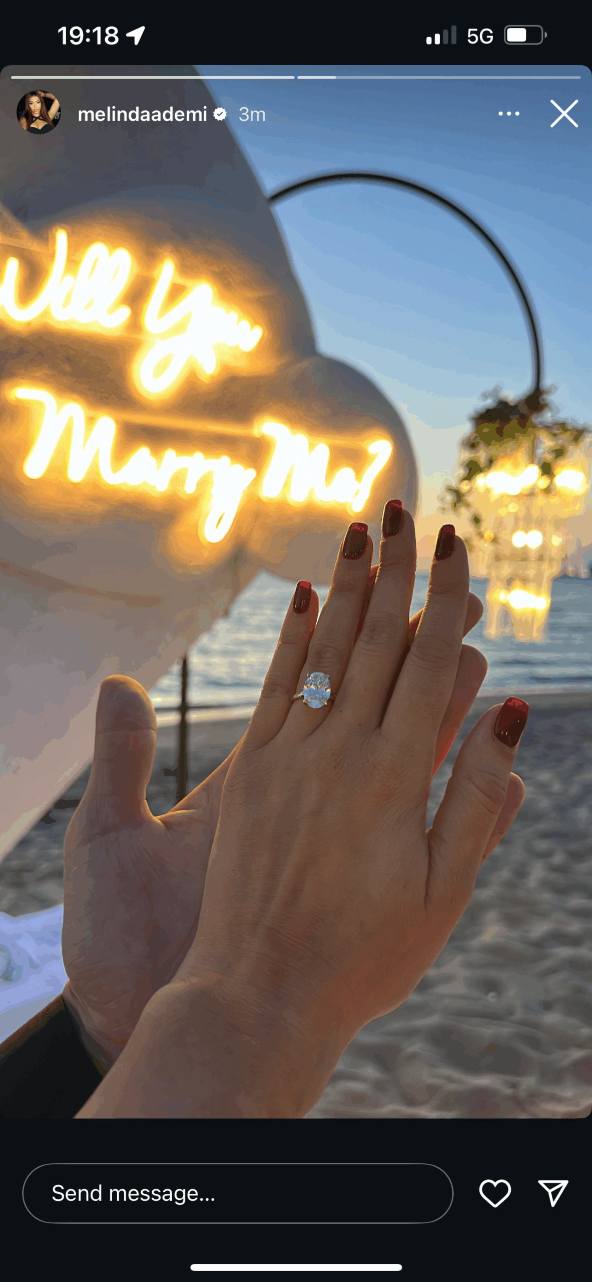 Në një postim emocionues në Instagram, Melinda publikoi foton ku shihet unaza e fejesës, ndërsa në prapaskenë ndriçon mbishkrimi romantik “Will You Marry Me?”.