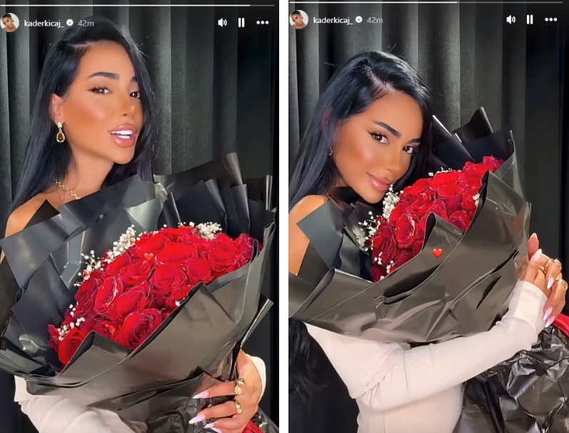 Në një fotografi të publikuar, Kaderi shihet duke mbajtur në duar një buqetë të madhe me trëndafila të kuq – simbol universal i dashurisë dhe romancës.