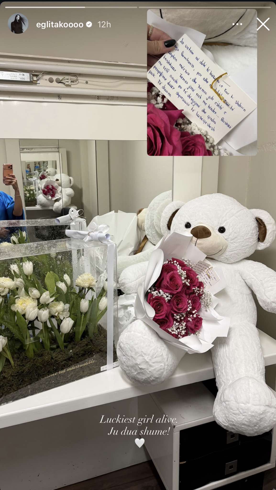 Së fundi, Egli ka ndarë me ndjekësit surprizat e bukura që ka marrë nga mbështetësit e saj, mes tyre një arushë pellushi, trëndafila të kuq dhe kartolina me urime.