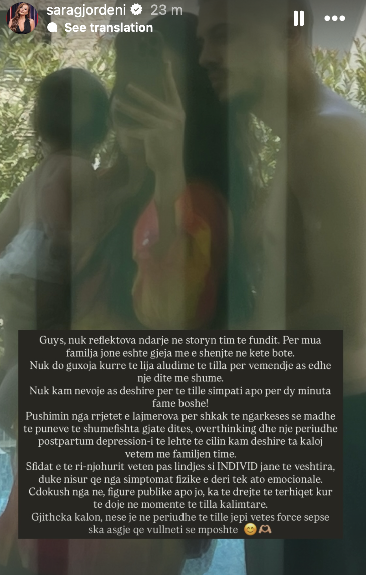 “Nuk reflektova ndarje në storyn tim të fundit. Për mua familja është gjëja më e shenjtë në këtë botë… Nuk kam nevojë për simpati apo për dy minuta fame boshe. Pushimin nga rrjetet e njoftova për shkak të ngarkesës dhe lodhjes. Gjithçka kalon nëse i jep vetes forcë,” – shkroi Sara mes të tjerash.