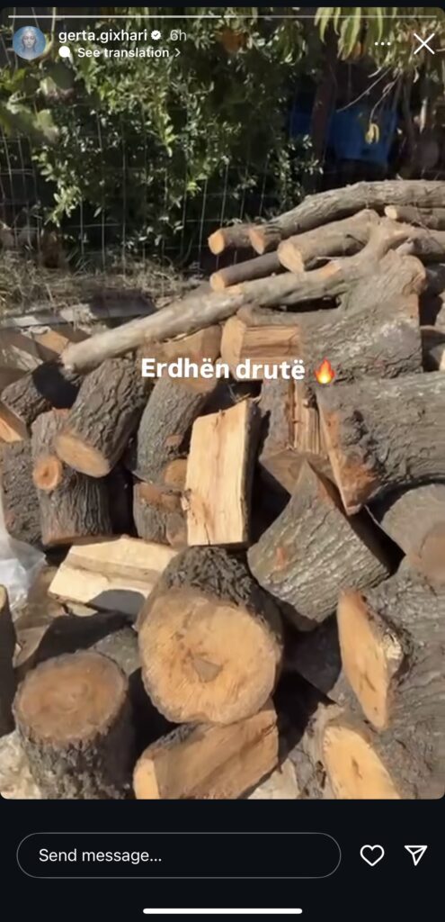 “Erdhën drutë 🔥”, ka shkruar ajo krahas një videoje ku shfaqet grumbulli i druve të prerë, gati për t’u përdorur gjatë dimrit.
