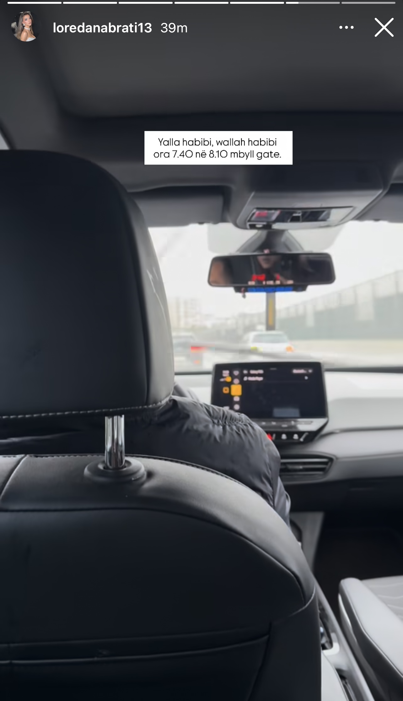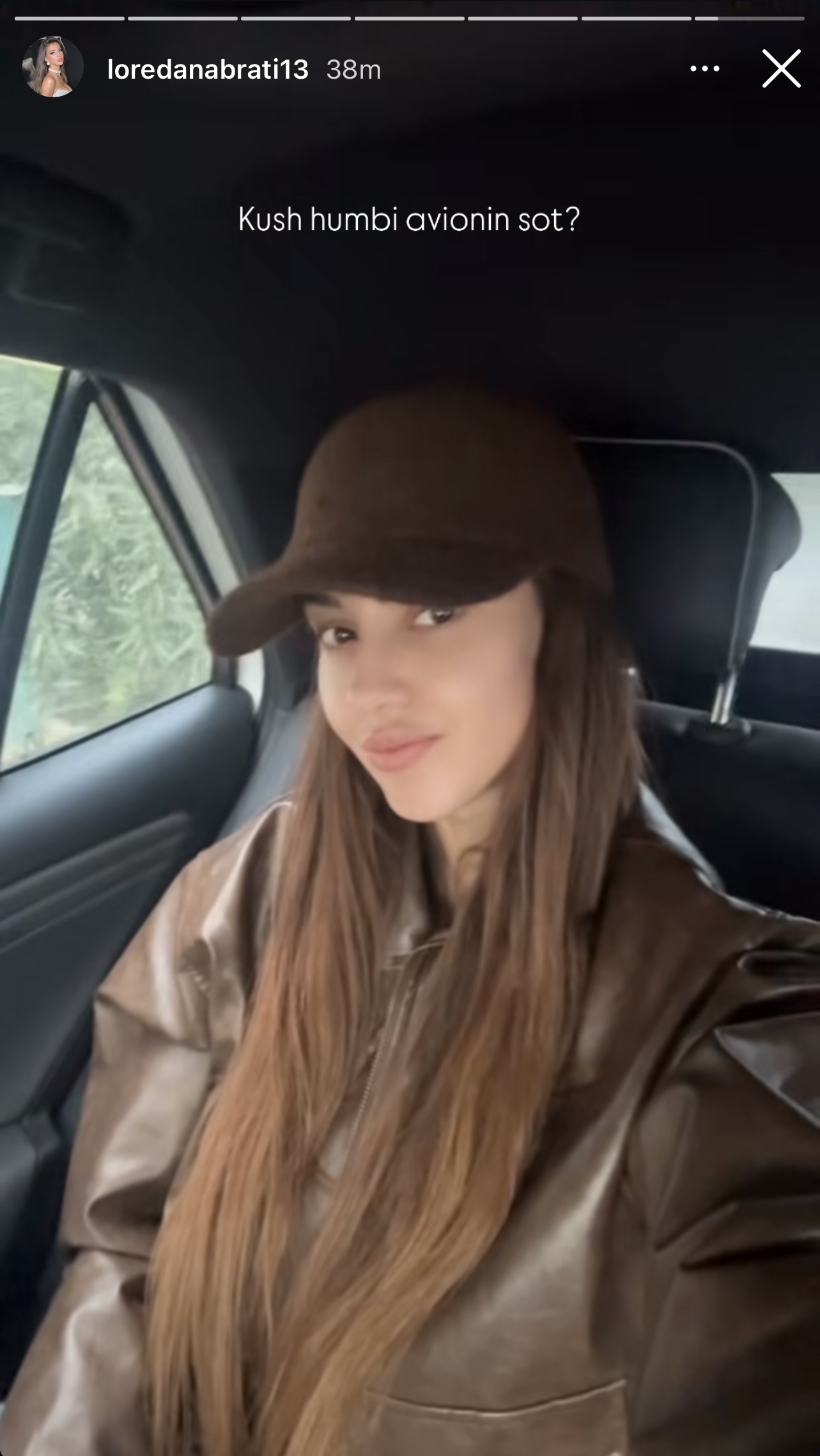 Në njërën nga storiet, Loredana shihet në makinë teksa shkruan me humor: “Kush humbi avionin sot?”, ndërsa në tjetrën shton: “Yalla habibi, wallah habibi ora 7:40 në 8:10 mbyll gate.”