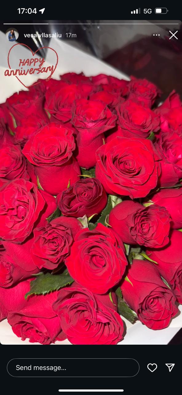 Në Instagram, ajo ka postuar një kolazh fotosh në përqafim me partnerin, shoqëruar me një buqetë trëndafilash të kuq dhe mbishkrimin “Gëzuar përvjetorin”.