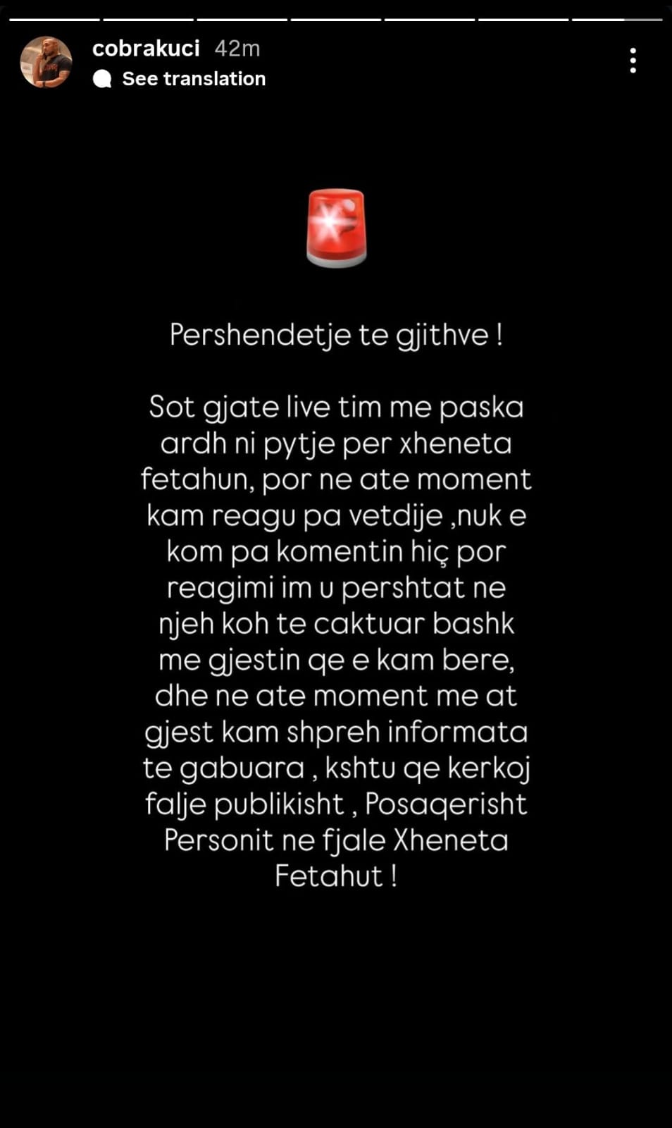 “Kam reaguar pa vetëdije, nuk e kam parë fare komentin. Me atë gjest kam shprehur informata të gabuara, ndaj kërkoj falje publikisht, posaçërisht personit në fjalë, Xheneta Fetahut”, shkroi ai ndër të tjera. /Prive By Liberta Spahiu