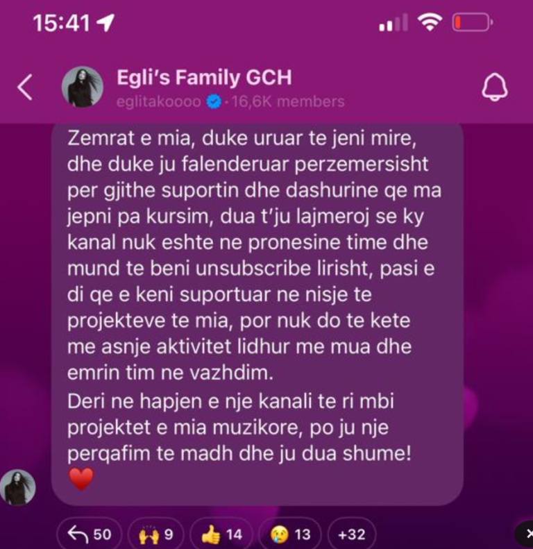 Ky njoftim tregon qartë se Egli ka vendosur të distancohet nga kanali aktual për arsye pronësie, duke shprehur mirënjohje për fansat.
