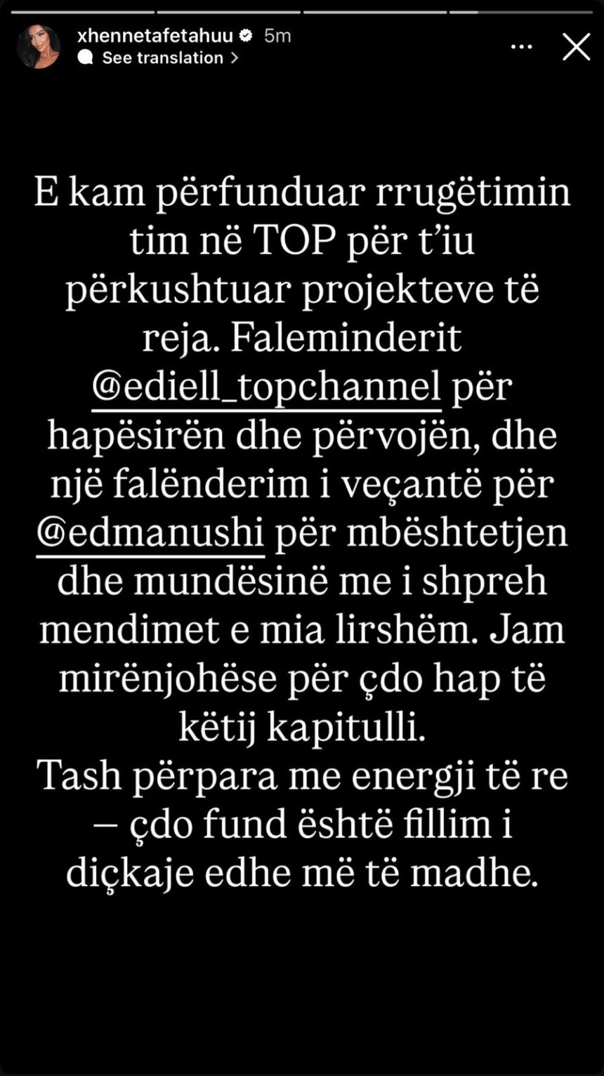 Përmes një postimi në llogarinë e saj në Instagram, Xheneta ka bërë të ditur se ka “përfunduar rrugëtimin” e saj me këtë kanal, për t’iu përkushtuar projekteve të reja.