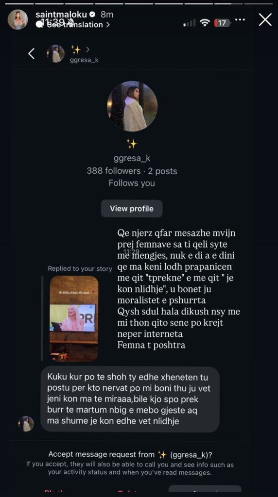 Ish-banorja e “Big Brother VIP Kosova 2”, Santiana Maloku, ka reaguar ashpër në profilin e saj në Instagram, duke publikuar një mesazh ofendues të marrë nga një vajzë dhe duke kthyer një përgjigje të fortë publike.