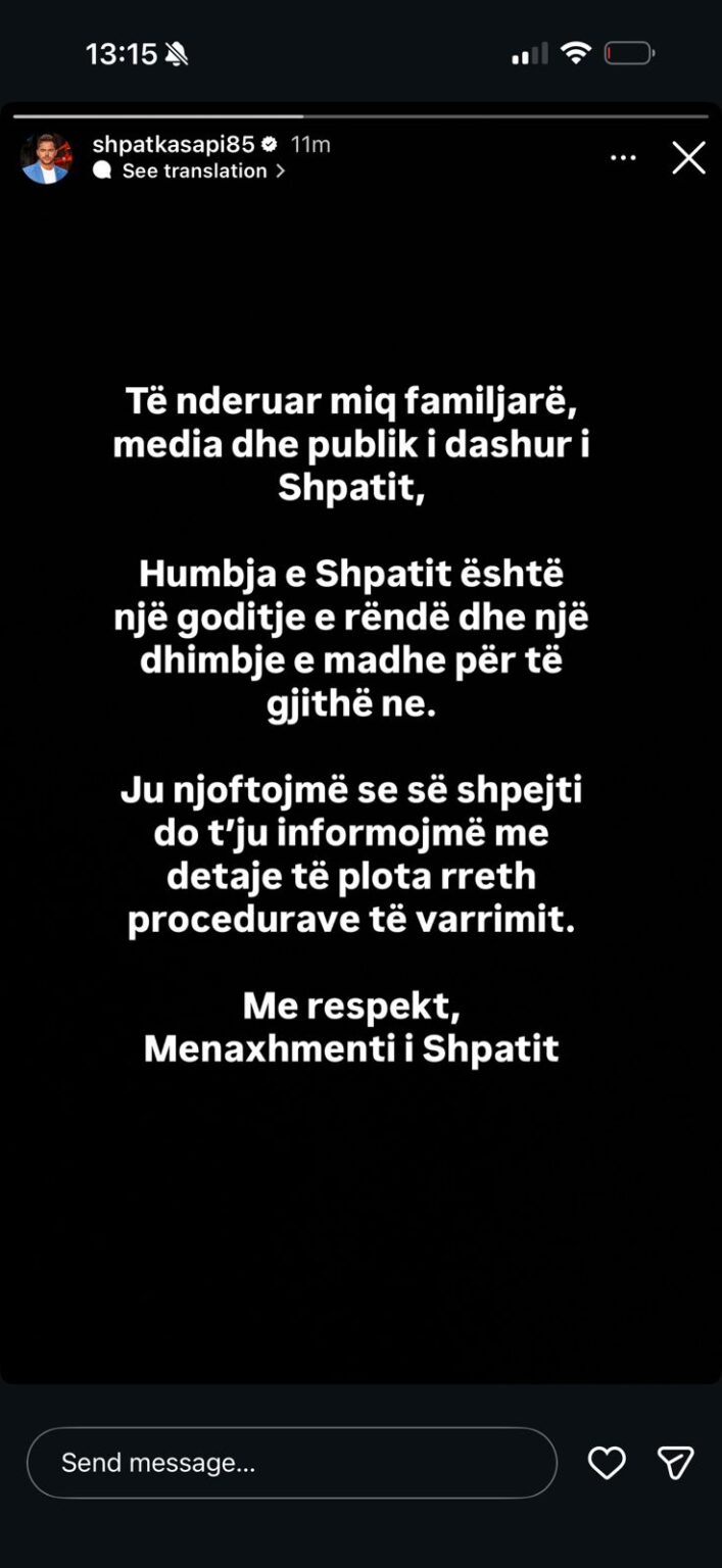 “Të nderuar miq, familjarë, media dhe publik i dashur i Shpatit, Humbja e Shpatit është një goditje e rëndë dhe një dhimbje e madhe për të gjithë ne. Ju njoftojmë se së shpejti do t’ju informojmë me detaje të plota rreth procedurave të varrimit. Me respekt, Menaxhmenti i Shpatit.”