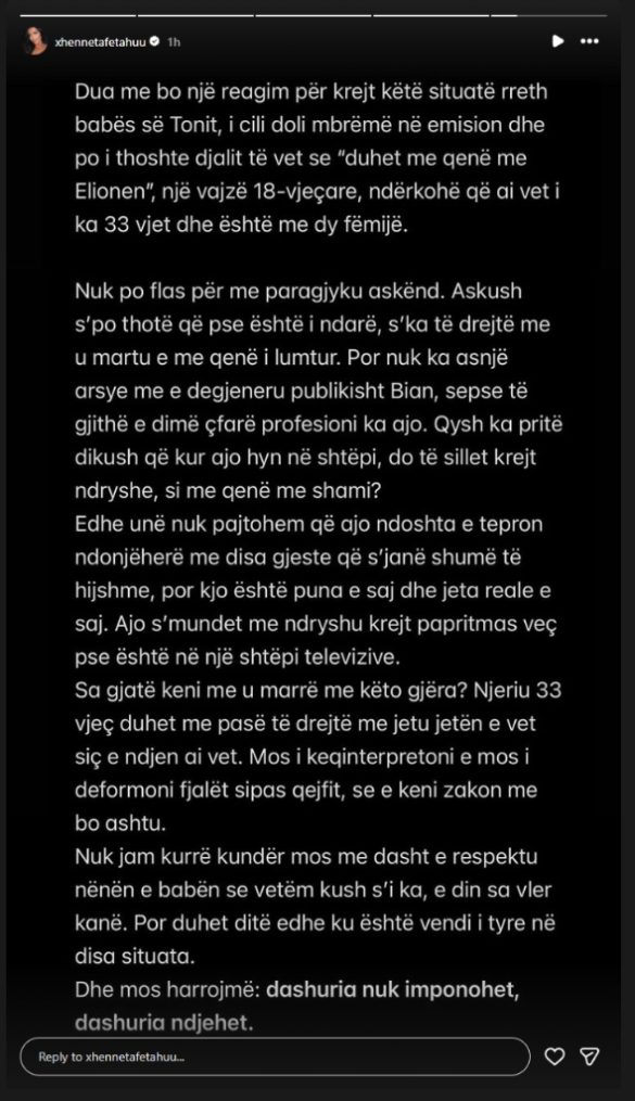 Në një postim në Instagram, Xheneta ka goditur fillimisht absurditetin e diferencës në moshë që babai i Tonit po promovonte, duke preferuar Eljonën.