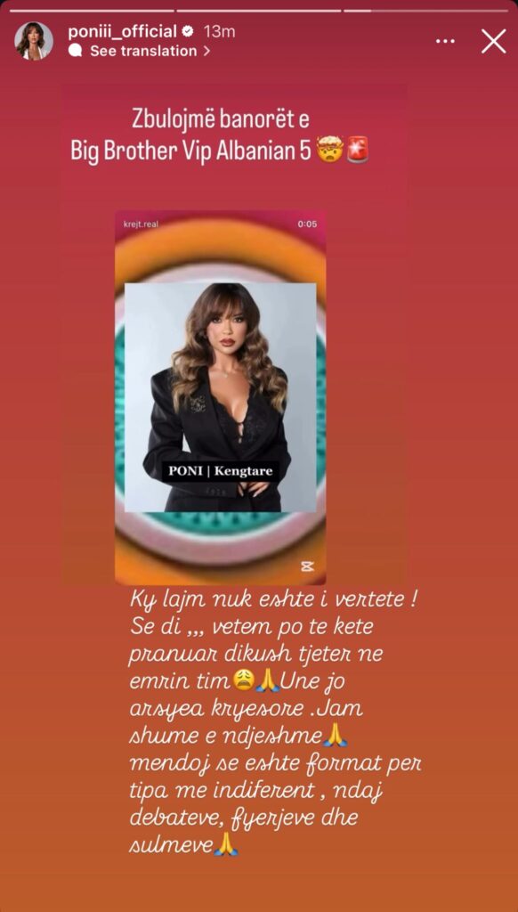 Në rrjet po qarkullon një listë “të supozuar” të banorëve të Big Brother VIP Albania 5, ku ndër emrat e përmendur ishte edhe ai i Ponit. Por këngëtarja ka reaguar menjëherë, duke hedhur poshtë çdo aludim me një deklaratë të drejtpërdrejtë në Instagram.
