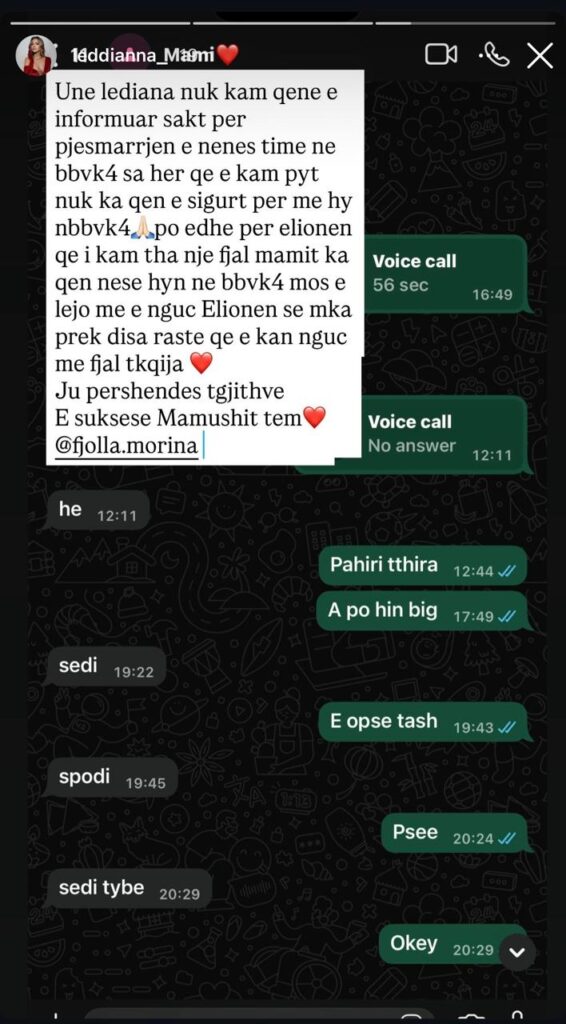 Ashtu si edhe ditën e sotme, në një tjetër mesazh të publikuar, Lediana ka sqaruar se nuk ka qenë e informuar saktë për pjesëmarrjen e nënës së saj në BBVK 4 dhe theksonte se Fjolla nuk ka qenë e sigurt për këtë.