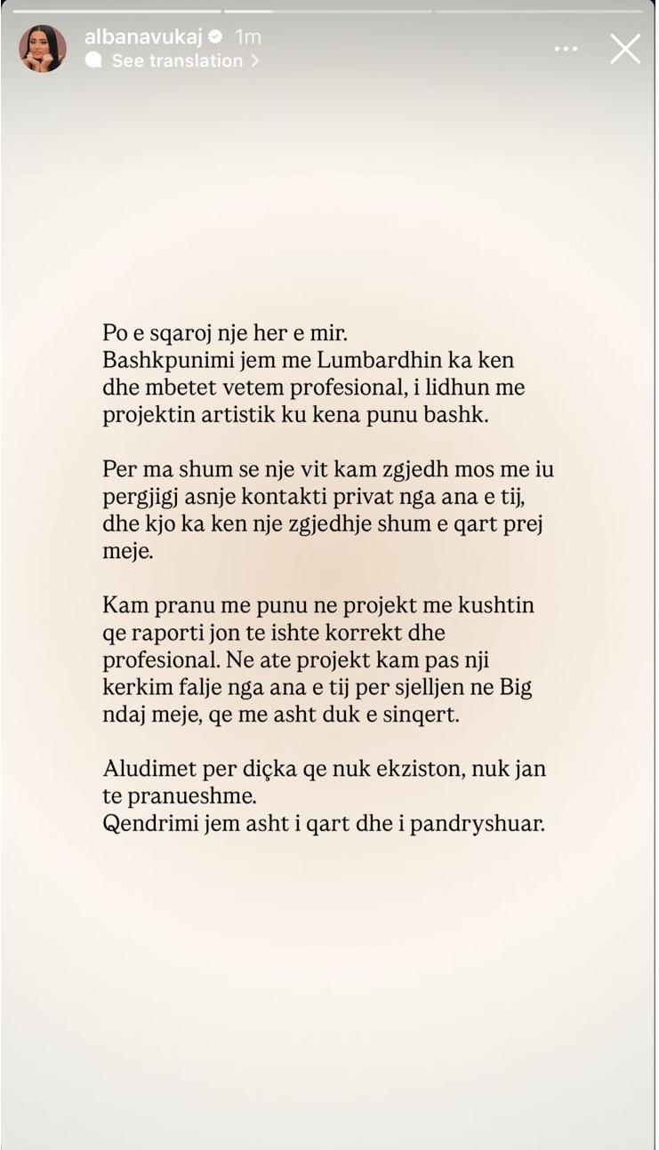 Në deklaratën e saj, Alba thekson se bashkëpunimi me Lumbardhin ka qenë dhe mbetet rreptësisht profesional. Ajo zbulon detaje të pathëna më parë, duke treguar se për një kohë të gjatë ka mbajtur distancë totale nga ai.