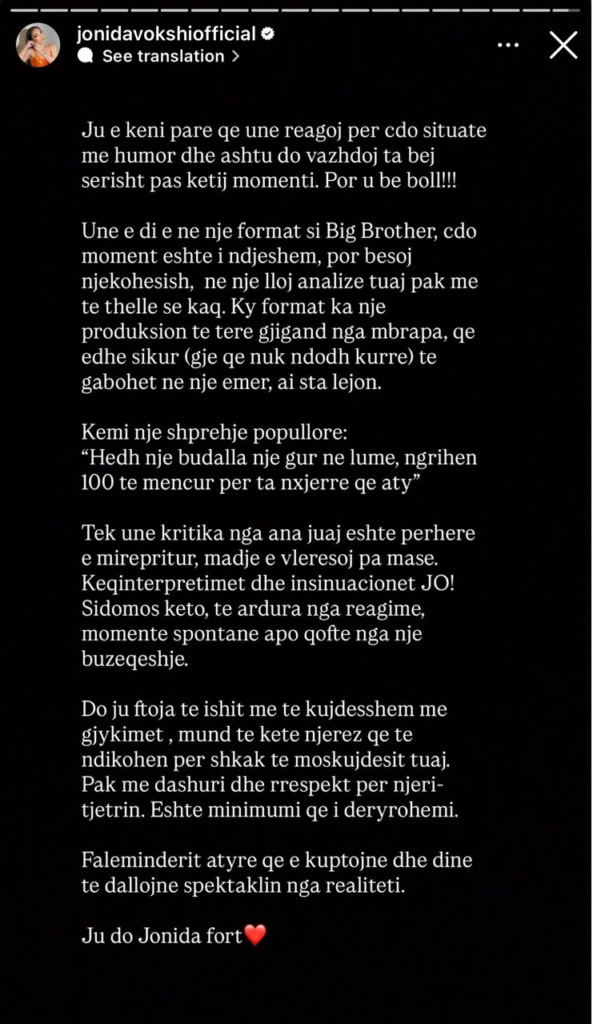Përballë këtyre zërave që nuk po shuheshin, Jonida ka vendosur të reagojë sërish, këtë herë përmes një postimi të gjatë dhe me tone të forta në llogarinë e saj në Instagram. Ajo theksoi se, ndonëse zakonisht i kalon situatat me humor, kësaj radhe durimi i saj ka sosur.