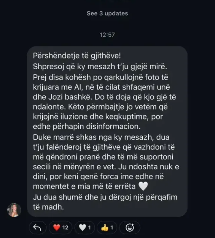 Reagimi vjen pas disa spekulimeve dhe thashethemeve lidhur me marrëdhënien e saj me Jozin, që u diskutua shumë gjatë qëndrimit të tyre në “Big Brother VIP Albania 4”. Pas daljes nga reality show, romanca e tyre nuk mbijetoi.