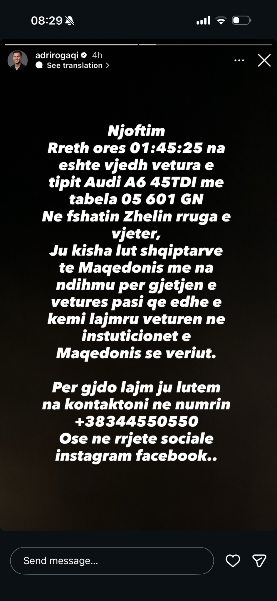 Makina e vjedhur është e tipit Audi. Adri u ka bërë thirrje publike të gjithë ndjekësve dhe në veçanti shqiptarëve të Maqedonisë së Veriut që të jenë me sy hapur dhe t’i ndihmojnë në gjetjen e mjetit, pasi kjo ngjarje ka ndodhur në atë territor.
