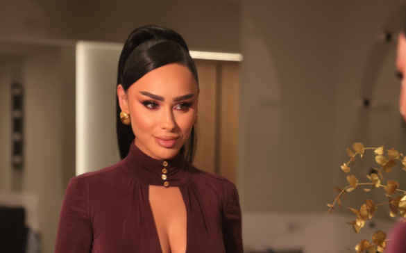 Prerja e veçantë e fustanit thekson linjat trupore, ndërsa grimi profesional dhe flokët e stiluar thjeshtë i japin pamjes një elegancë të rafinuar.