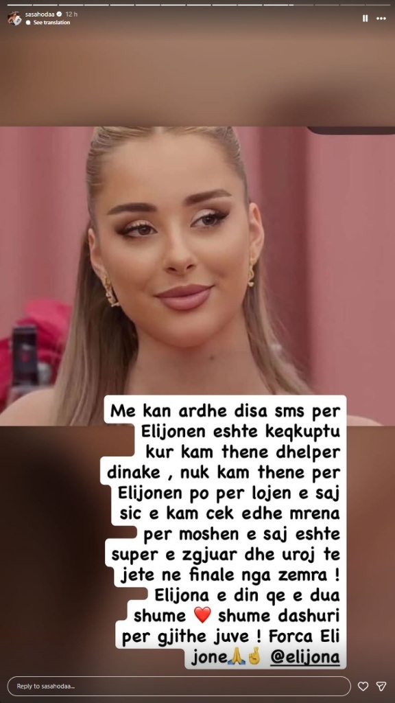 “Për moshën e saj është super e zgjuar dhe uroj të jetë në finale nga zemra! Elijona e din që e dua shumë,” – përfundon Sasa, duke e shoqëruar postimin me thirrjen “Forca Elijona”.