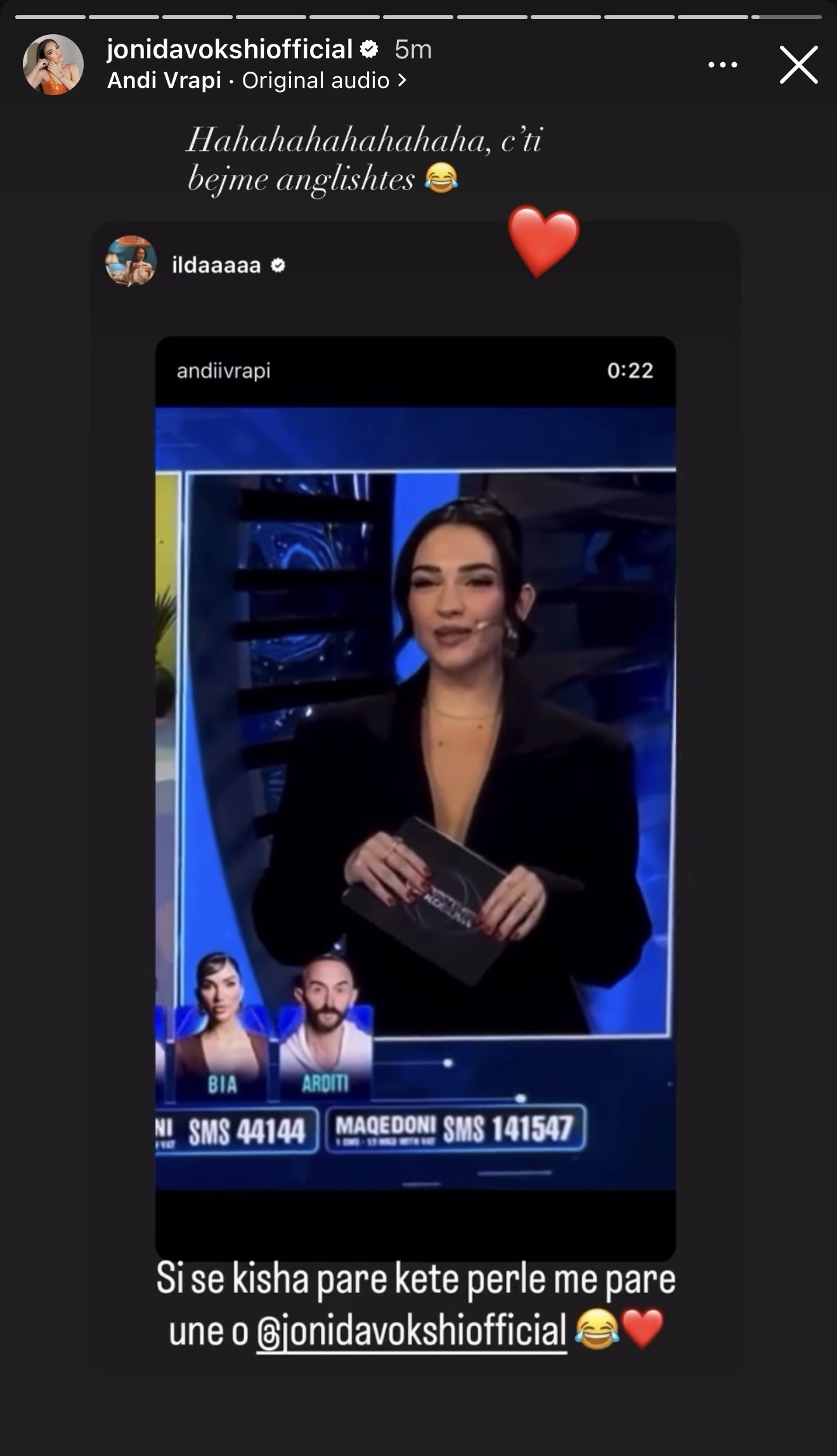 Ky lapsus simpatik nuk u shpëtoi “skifterëve” të rrjeteve sociale, duke u bërë menjëherë viral në TikTok dhe Instagram. Por, “qershia mbi tortë” ishte vetë reagimi i Jonidës. Pa komplekse dhe me shumë auto-ironi, ajo e ka ripostuar videon e gafës së saj në Instastory.