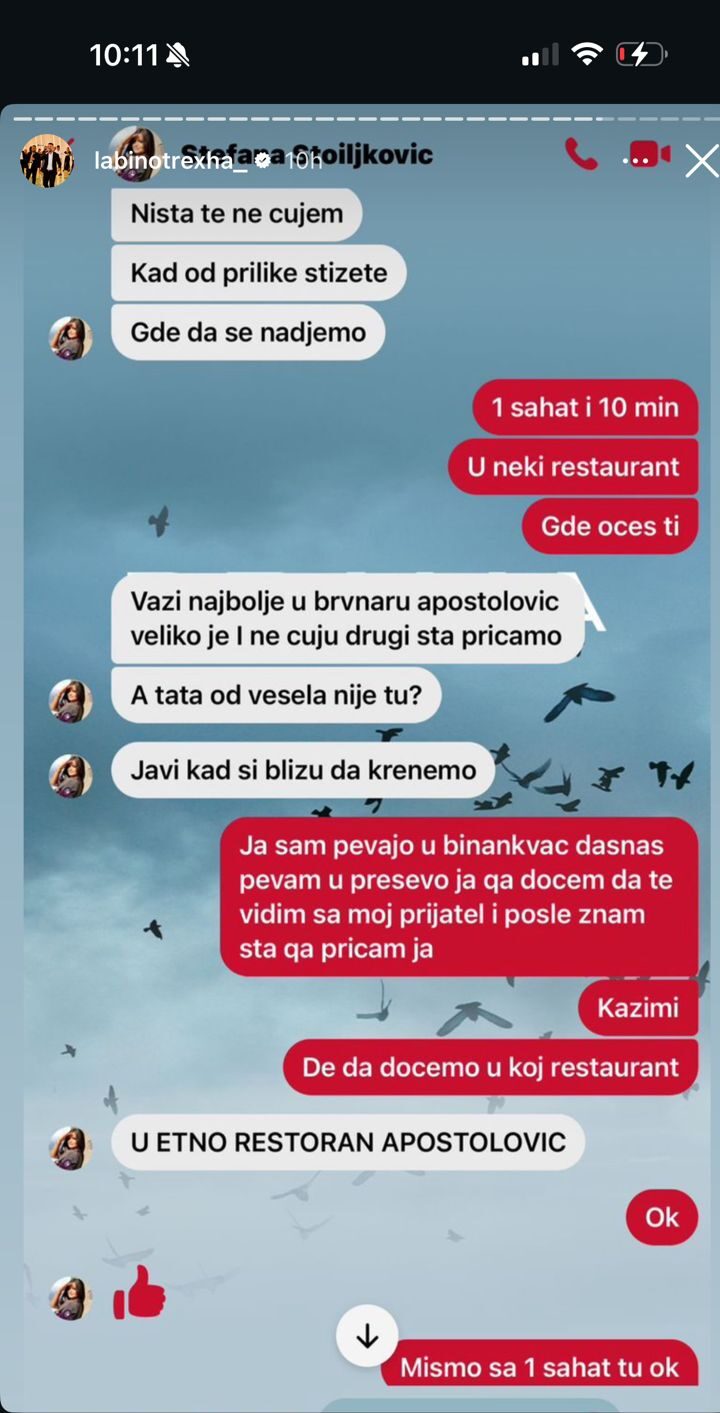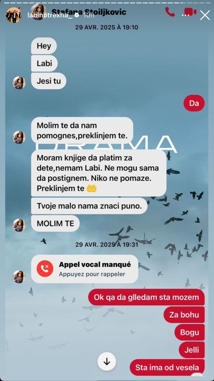 Për të vërtetuar pafajësinë e tij, menaxhmenti ka publikuar disa screenshots të bisedave private në Instagram midis Labit dhe gruas serbe të quajtur Stefana Stoiljkovic. Në këto mesazhe, shihet se gruaja i drejtohet këngëtarit duke i kërkuar ndihmë financiare për të paguar librat e fëmijës së saj. “Të lutem na ndihmo, të përgjërohem… Nuk mund t’ia dal vetë, askush nuk më ndihmon,” shkruhet në njërën prej porosive, ku ajo thekson se “ndihma e tij do të thotë shumë për ta”.