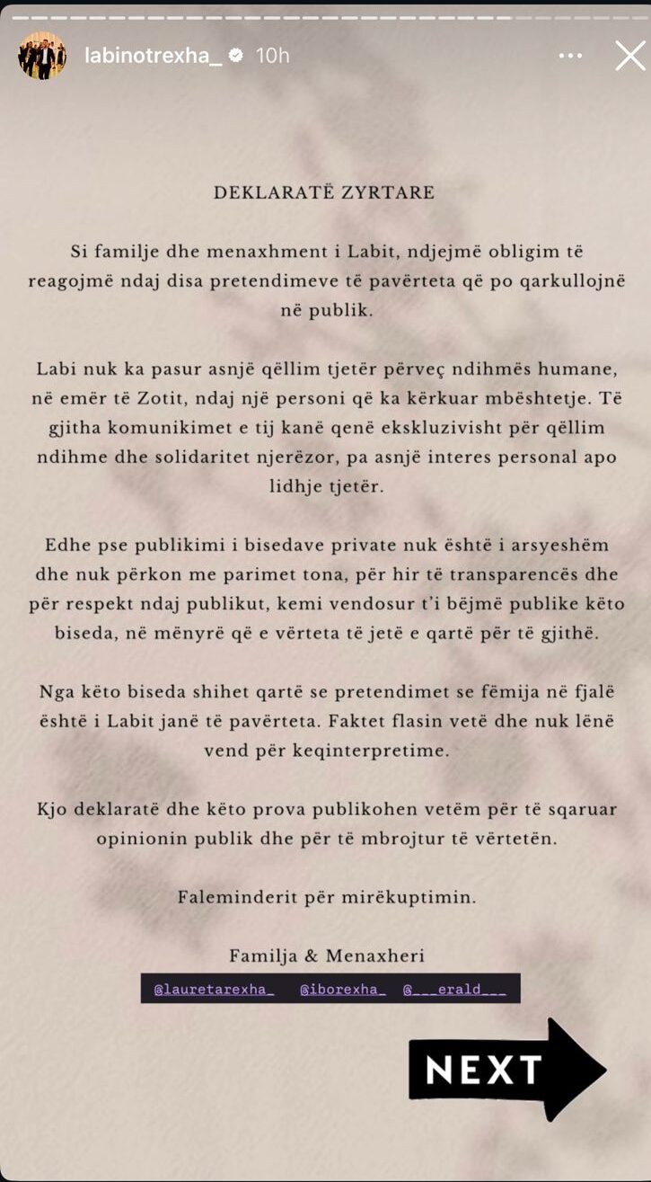 Në fillim të deklaratës, familja e Labit thekson se publikimi i këtyre bisedave private nuk është një veprim që ata do ta dëshironin, por është bërë i domosdoshëm për hir të transparencës dhe për të mbrojtur integritetin e banorit të BBVK.