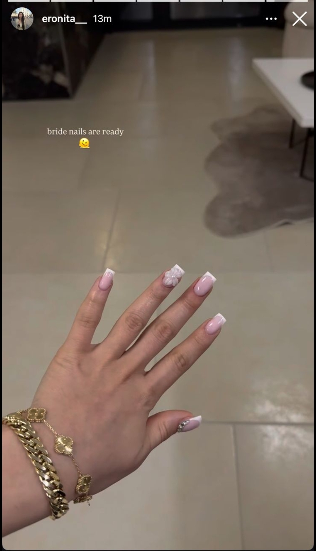 Në një foto të publikuar në Instagram, ajo ka treguar thonjtë e saj të ri, të punuar me një stil elegant dhe detaje lulesh, por vëmendjen e ka rrëmbyer mbishkrimi i saj i drejtpërdrejtë: “Thonjtë e nuses janë gati”.