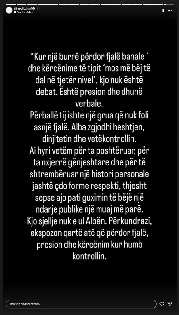 “Ai hyri vetëm për ta poshtëruar, për ta nxjerrë gënjeshtare dhe për të shtrembëruar një histori personale jashtë çdo forme respekti, thjesht sepse ajo pati guximin të bëjë një ndarje publike një muaj më parë,” shkruhet në reagimin e postuar në InstaStory.