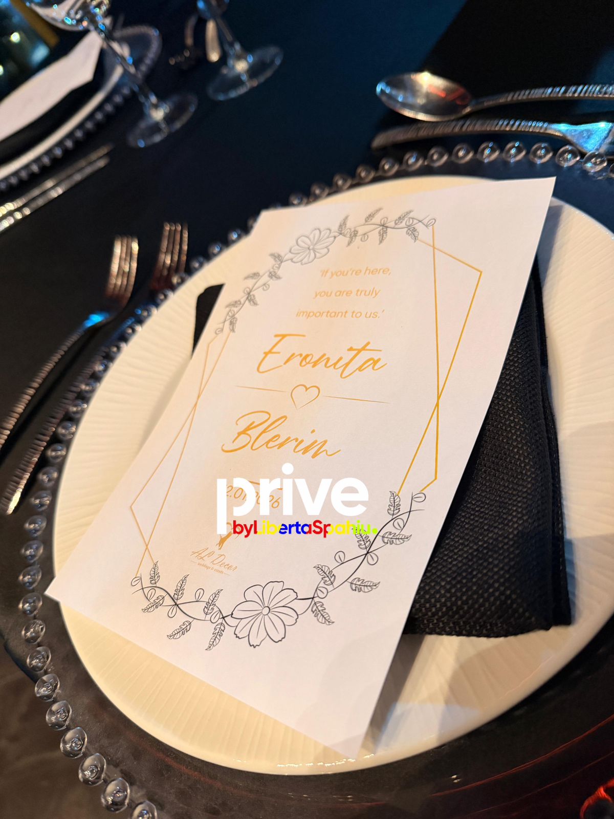 Detajet e personalizuara nuk kanë munguar, ku në tavolinat e të ftuarve shihen kartolina mirëseardhjeje me emrat e çiftit, “Eronita & Blerin”, dhe një mesazh falënderues për praninë e tyre në këtë ditë kaq të rëndësishme.