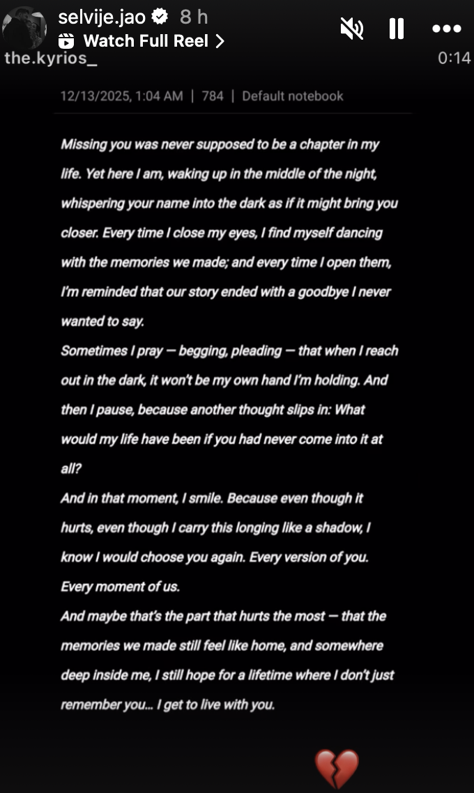 Në postim thuhet se si jeta ka marrë një rrjedhë që ajo nuk e kishte parashikuar kurrë. ‘Zgjohem në mes të natës duke pëshpëritur emrin e tij në errësirë, me shpresën e kotë se kjo mund të të sjellë më pranë’.
