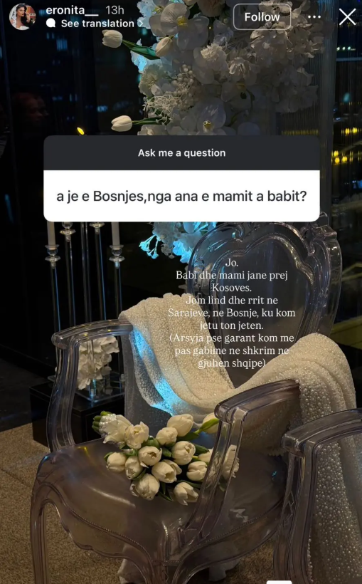 Ky sqarim vjen pas komenteve të shumta që rrethuan çiftin e ri menjëherë pas kurorëzimit të dashurisë së tyre. Eronita, me këtë deklaratë, ka treguar se është krenare për prejardhjen e saj dhe dëshiron ta ndajë këtë me të gjithë ata që e ndjekin.
