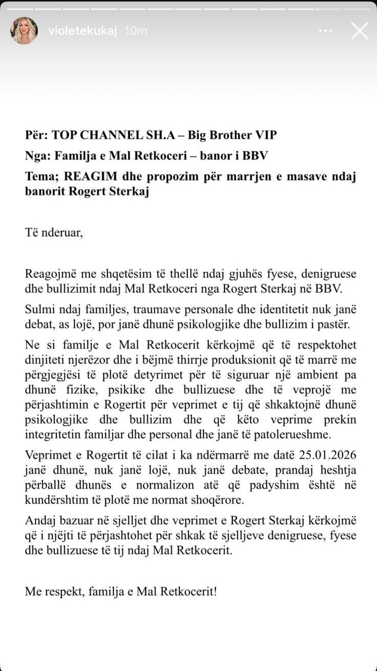 Familja e Malit i bën thirrje produksionit të marrë masa urgjente dhe të mbajë përgjegjësi për sigurimin e një ambienti pa dhunë. Ata kërkojnë zyrtarisht përjashtimin e Rogert Sterkaj nga gara, duke argumentuar se heshtja ndaj veprimeve të tilla vetëm sa e normalizon dhunën dhe bullizmin në ekranet televizive.
