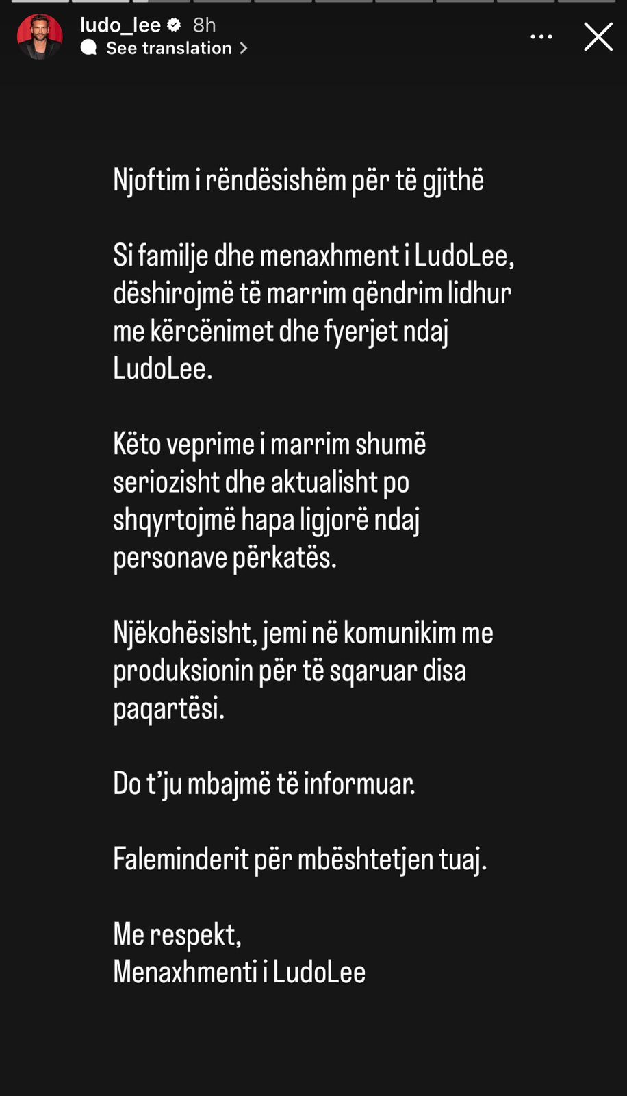 Llogaria zyrtare e konkurrentit të Big Brother VIP Kosova, Ludo Lee, ka publikuar një reagim të ashpër dhe zyrtar pas zhvillimeve të fundit.