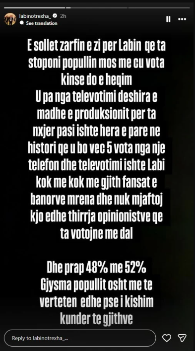 “E sollët zarfin e zi për Labin që ta stoponi popullin, mos me çu vota kinse do e heqim. U pa nga televotimi dëshira e madhe e produksionit për ta nxjerrë, pasi ishte hera e parë në histori që u bënë vetëm 5 vota nga një telefon dhe televotimi ishte Labi kokë më kokë me gjithë fansat e banorëve mrena dhe nuk mjaftoi kjo, edhe thirrja e opinionistëve që ta votojnë me dalë.