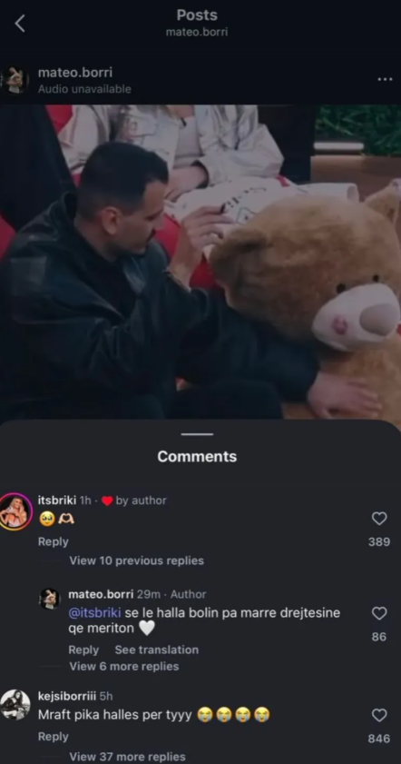 Familja e Brikenës, e cila menaxhon llogarinë e saj, ka reaguar fillimisht me emoji plot dashuri dhe emocione në postimin e Mateos. Por, vëmendjen e ka rrëmbyer motra e Mateos, Kejsi Borri.