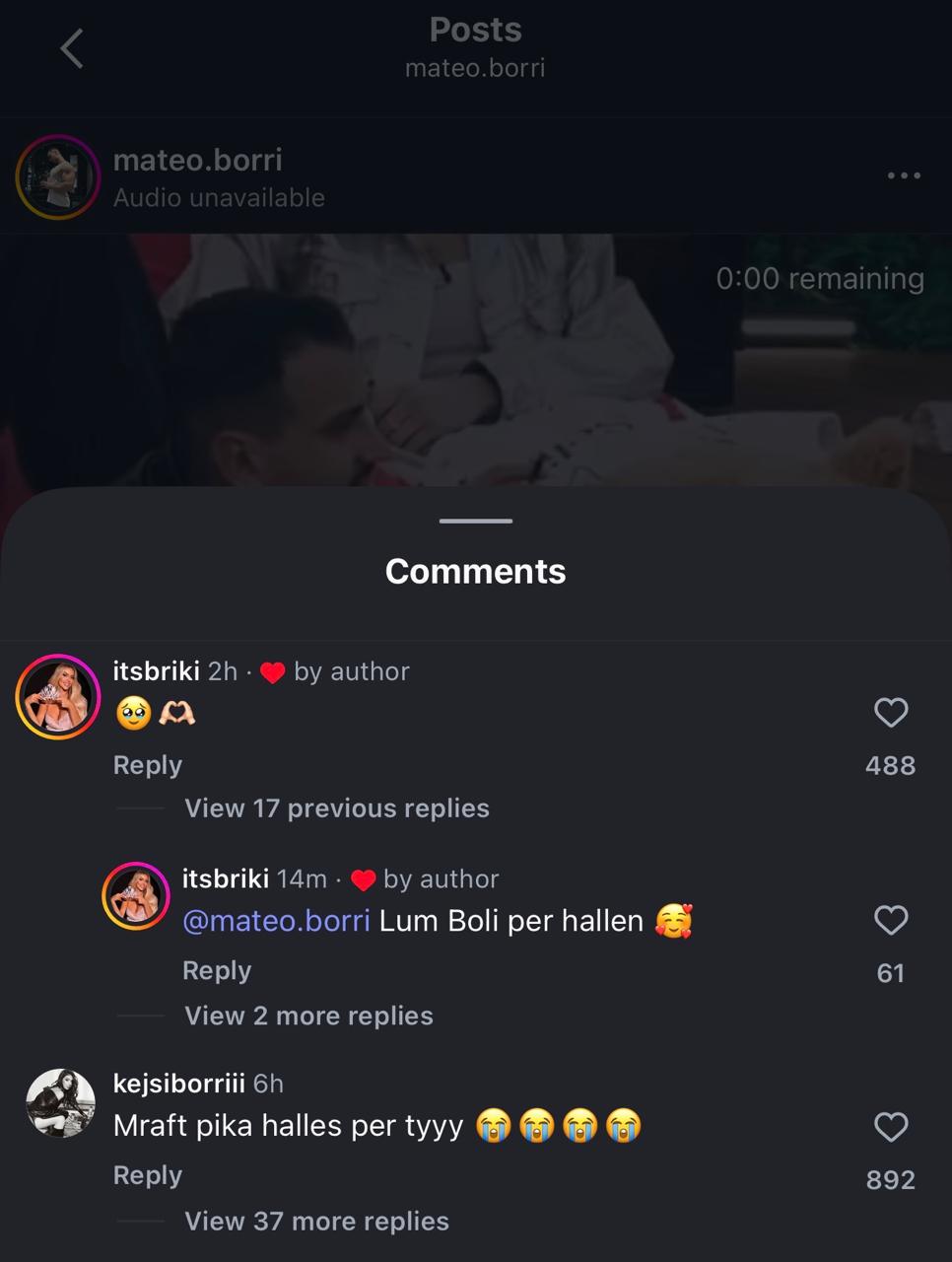 Gjithçka nisi në llogarinë zyrtare të Mateos në Instagram, ku familja e Brikenës (e cila menaxhon faqen e saj) la fillimisht një koment me emoji zemër.
