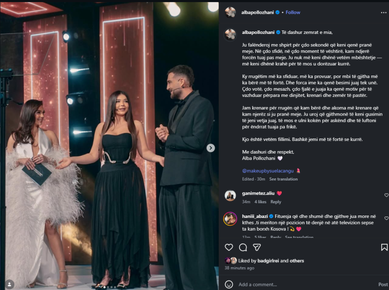 Alba Pollozhani ka emocionuar ndjekësit me një postim të ndjerë në rrjetet sociale, ku ka falënderuar publikisht të gjithë ata që e kanë mbështetur gjatë rrugëtimit të saj.