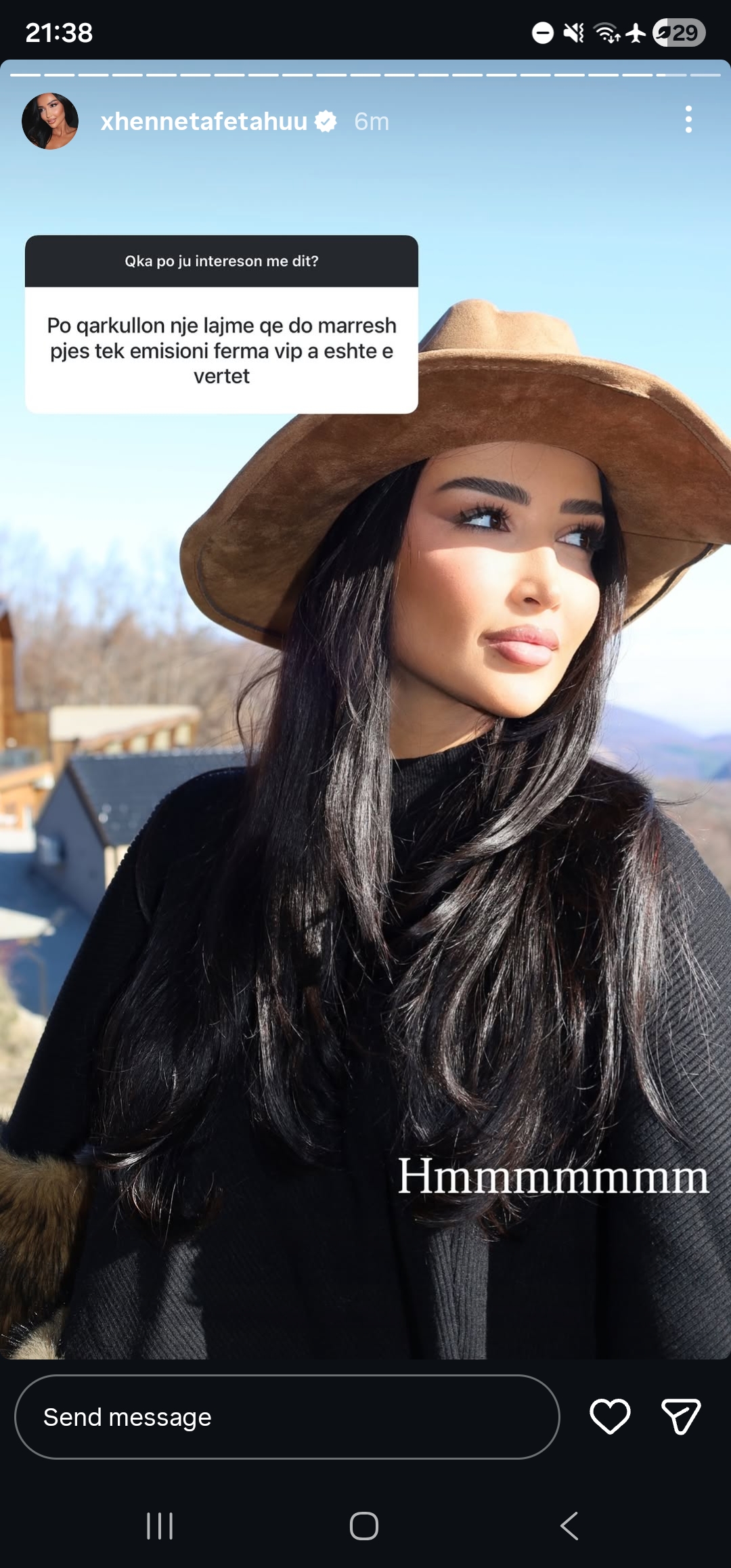 Lidhur me këto lajme, vetë Xheneta ka bërë një reagim në llogarinë e saj në Instagram. Gjatë një bisede virtuale, kur u pyet drejtpërdrejt nga një ndjekës nëse është e vërtetë që do të marrë pjesë në këtë emision, ajo zgjodhi të mos japë një përgjigje të prerë. Xheneta postoi vetëm një “Hmmmmmmmm”, duke e shoqëruar reagimin me një fotografi ku shfaqet e veshur me një kapele prej kamoshi. Ky është një detaj vizual tipik që përshtatet mjaft mirë me tematikën e programit.