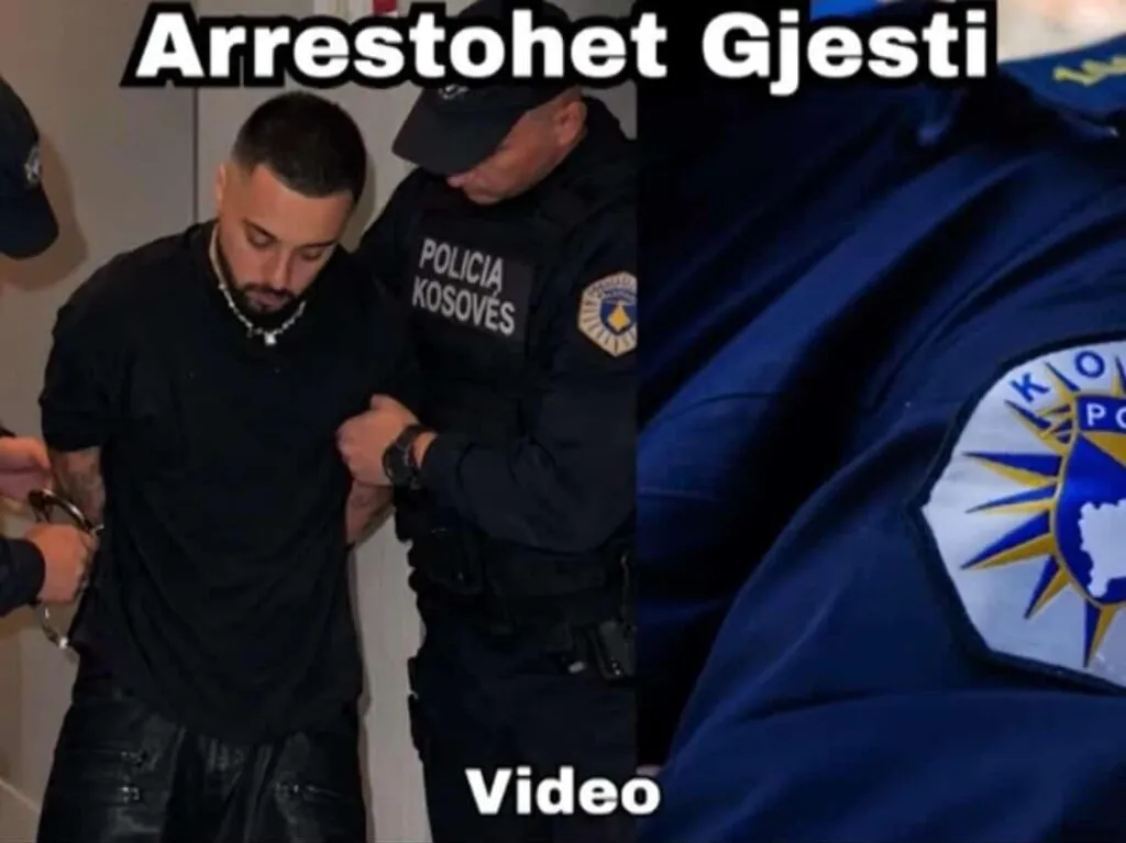 Bëhet fjalë për një imazh ku Gjesti shfaqet me kokën ulur, teksa po i vihen prangat nga dy efektivë me uniformën e “Policisë së Kosovës”, shoqëruar me mbishkrimin e madh: “Arrestohet Gjesti – Video”.