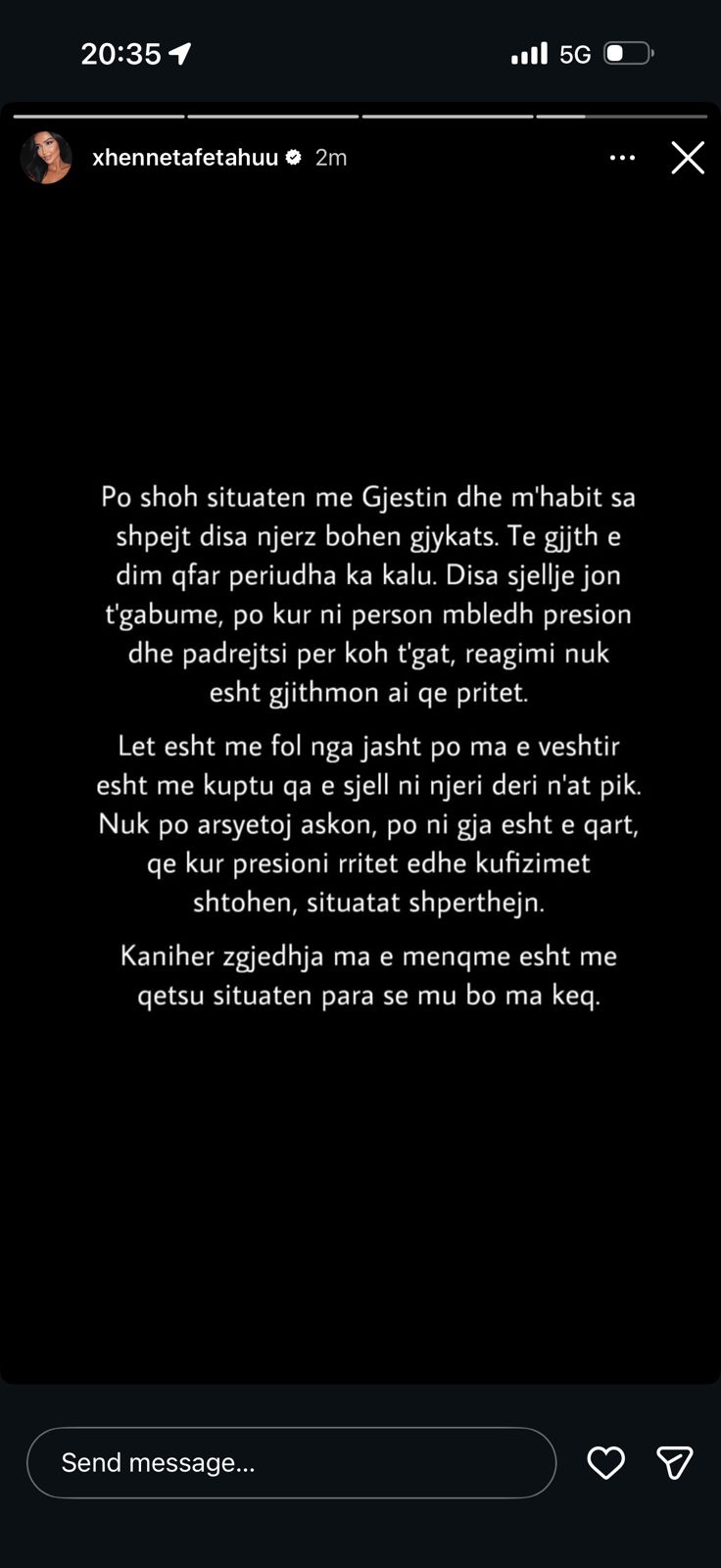 Për ta bërë edhe më të qartë qëndrimin e saj, Xheneta citoi thelbin e problemit duke shkruar: “Nuk po arsyetoj askënd, por një gjë është e qartë, që kur presioni rritet edhe kufizimet shtohen, situatat shpërthejnë.”