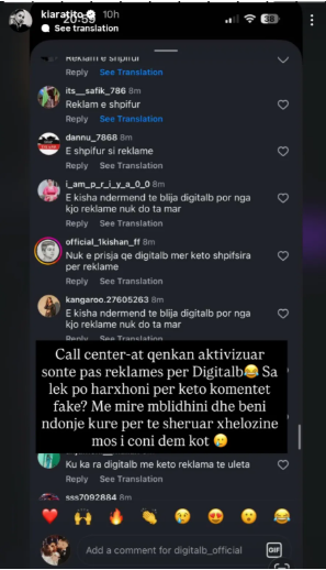“Call center-at qenkan aktivizuar sonte pas reklamës për Digitalb. Sa lek po harxhoni për këto komentet fake? Më mirë mblidhini dhe bëni ndonjë kurë për të shëruar xhelozinë mos i çoni dëm kot,” – ka shkruar Kiara krahas pamjeve, duke e mbyllur këtë situatë me një mesazh të drejtpërdrejtë për “ziliqarët”.