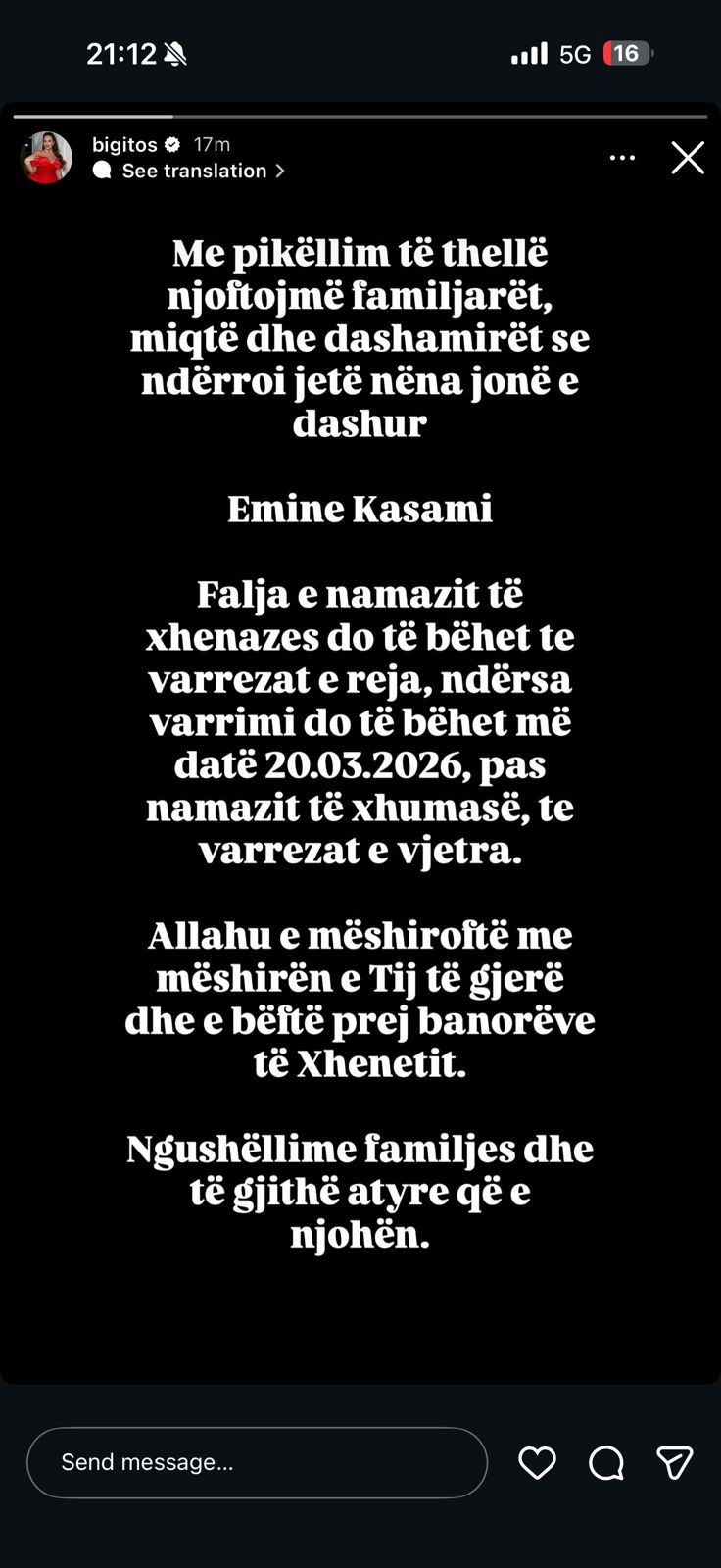 Në njoftimin e shpërndarë, këngëtarja ka dhënë edhe detajet e ceremonisë mortore për të gjithë ata që duan t’i japin lamtumirën e fundit nënës së saj. Falja e namazit të xhenazes do të mbahet te varrezat e reja, ndërsa ceremonia e varrimit do të zhvillohet nesër, më datë 20 mars 2026, pas namazit të xhumasë, në varrezat e vjetra. Ky është një detaj që tregon respektin dhe traditën me të cilën familja po i jep lamtumirën e fundit njeriut të tyre të dashur.