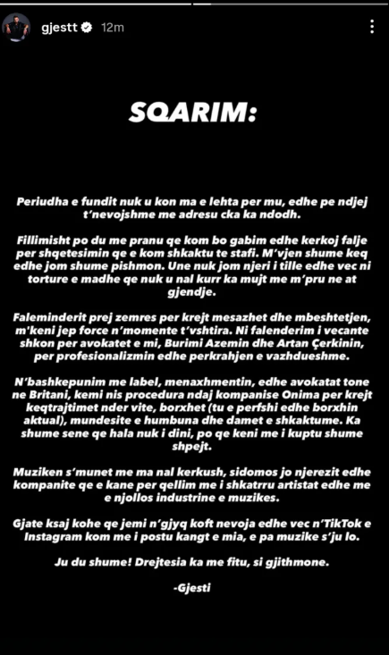Më tej, Gjesti ka bërë të ditur se, në bashkëpunim me ekipin e tij ligjor, ka nisur procedurat gjyqësore ndaj kompanisë “Onima”, duke i akuzuar për keqtrajtime ndër vite, borxhe të pashlyera, mundësi të humbura dhe dëme të shkaktuara. Për t’i dhënë një mesazh të qartë publikut dhe tregut muzikor, ai shtoi: