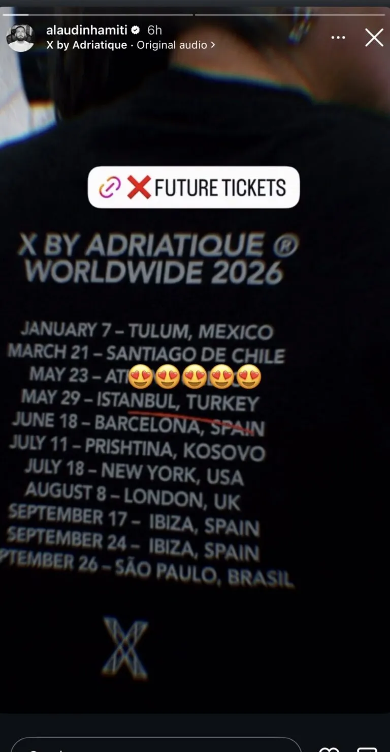 Përmes një postimi në llogarinë e tij në Instagram, Alaudini ka ndarë me ndjekësit datat e turneut botëror të “X by Adriatique”, duke vënë theksin tek data 11 Korrik 2026, ditë kur ky event zbret në Prishtinë.