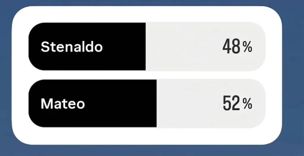 Rezultatet vizuale tregojnë një diferencë minimale: Mateo kryeson me një avantazh të lehtë prej 52% të votave, ndërsa Stenaldo e ndjek nga afër me 48%.
