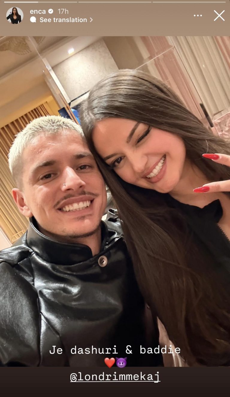 Në fotografinë e publikuar, dyshja shihen pranë njëri-tjetrit në një ambient të përbashkët. Krahas imazhit, Enca ka shkruar një mesazh të shkurtër për të, duke e cilësuar me fjalët “Je dashuri”.