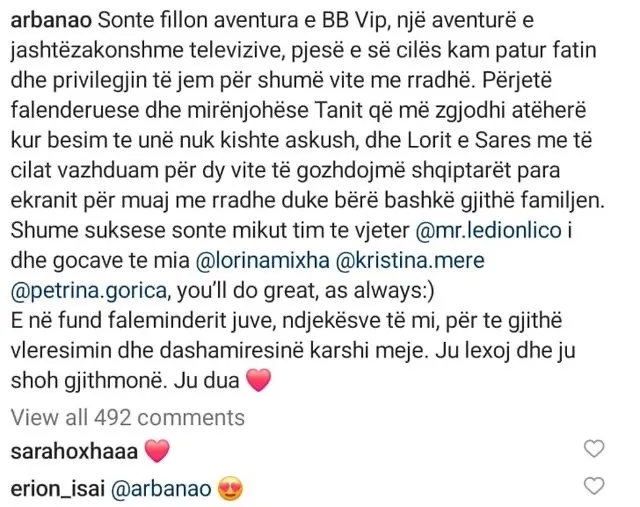 Kur Ledion Liço zëvendësoi Arbanën në drejtimin e BBV, ajo bëri një postim të gjatë mbështetës në rrjetet sociale, ku ndër të tjera shkruante: “Shumë suksese sonte mikut tim të vjetër @mr.ledionlico dhe gocave të mia @lorinamixha @kristina.mere @petrina.gorica, you’ll do great, as always”.