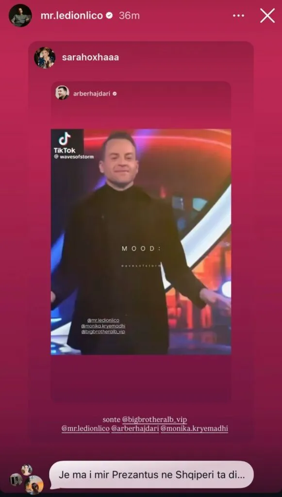 Videoja, e cila shfaq Ledion Liçon, Monika Kryemadhin dhe Arbër Hajdarin duke kërcyer në një atmosferë tejet të relaksuar në studion e “Big Brother VIP”, u ripostua menjëherë nga producentja Sara Hoxha dhe më pas nga vetë Ledioni.