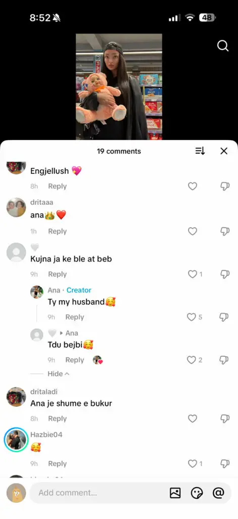 Ana në rrjetin e saj Tiktok, i ka kthyer komentin një llogarie duke e quajtur ”burri im” e që nuk është Kevini./indeksonline