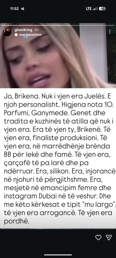 Më pas, ka lëshuar një sërë ofendimesh të rënda drejt Brikenës, duke shkruar: “Erë të vjen ty, Brikenë. Të vjen erë finaliste produksioni. Të vjen erë, në marrëdhënie brenda BB për lekë dhe famë. Të vjen erë, çarçafë të palarë… Erë silikon, erë injorancë… mesjetë në emancipim femre dhe Instagram Dubai në të veshur.”