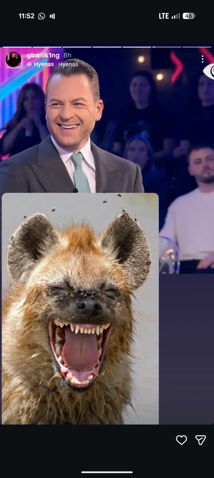 Për ta përforcuar këtë sulm ndaj moderatorit, G-Bani ka postuar edhe një fotomontazh ku e krahason të qeshurën e Ledionit me atë të një hiene të rrethuar nga mizat.