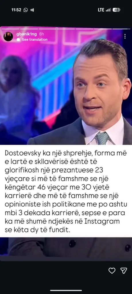 Për ta mbyllur këtë reagim të ashpër, G-Bani ka përdorur një referencë nga Dostojevski për të goditur standardet aktuale të televizionit dhe glorifikimin e personazheve bazuar vetëm te rrjetet sociale.